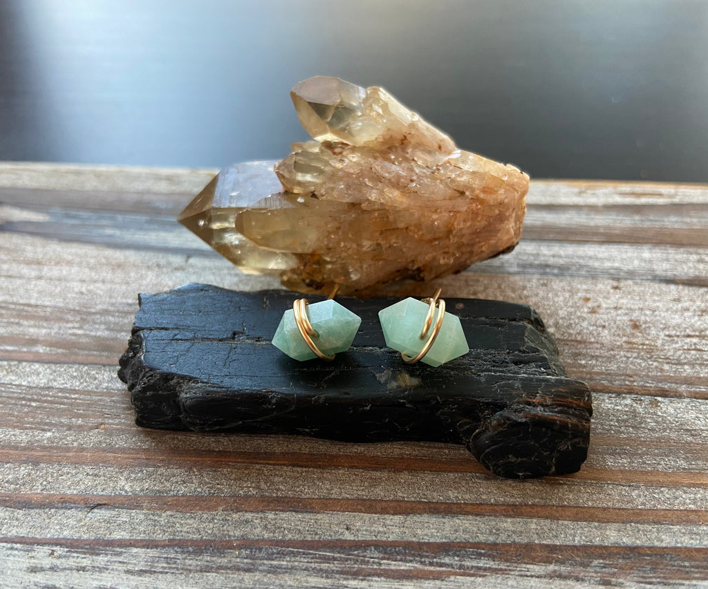 One of my personal all time favorites, this pair of hand cut and faceted natural Amazonite studs are a beautiful way of reminding yourself to speak your hearts truth! Wrapped in either Gold Filled or Sterling Silver USA sourced wire. The energy of this stone supports