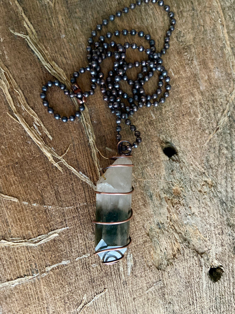 A rare, large point of Chlorite in Quartz aka Lodolite. Chlorite in Quartz is a powerful healing combination. The Quartz amplifies the purifying, detoxifying properties of the Chlorite making it one of the best crystals to use for physical cleansing. Chlorite not only works with the physical body, but the auric body as well. Chlorite will help to cleanse the aura, chakras and energy meridians. Chlorite is a great piece to use when there is excessive anger or frustration, gently removing and dissipating the energy. Chlorite in Quartz will help to resolve issues of the heart and remove blockages and resistance that will allow one to acknowledge, forgive, release, and move forward. Simplistically wire wrapped in pure USA Copper.