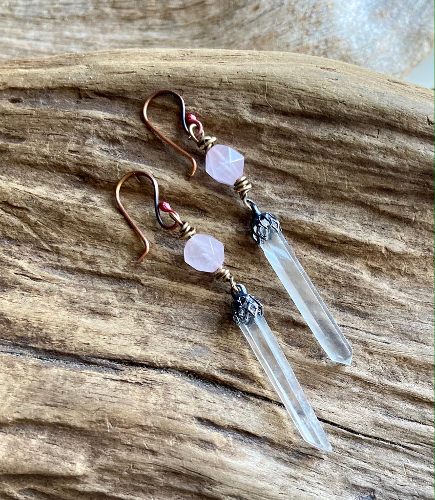 YOUR HEART NEEDS YOU! The strength of Clear Lemurian Seed Quartz combined with the nurturing quality of Rose Quartz support the energy of Self Love and Appreciation. Mixed metals of sterling Silver, Copper and Brass enhance energetic flow and complete this gorgeous pair!