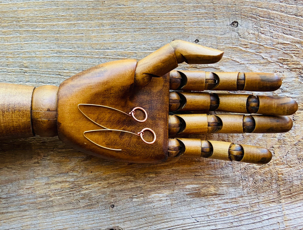 A perfect blend of pure USA hand hammered copper and raw brass, this elegant pair of minimalistic mixed metal earrings radiates